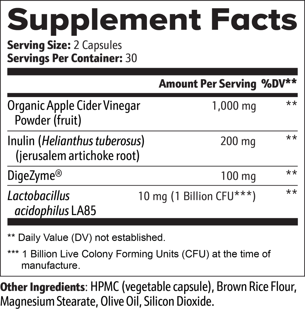 Gut Health is formulated to provide comprehensive support for your digestive system, promoting a balanced gut environment and overall wellness. This dietary supplement combines Apple Cider Vinegar Powder, known for its natural digestive properties, and Inulin, a prebiotic fiber from Jerusalem artichoke root, to nourish beneficial gut bacteria.*